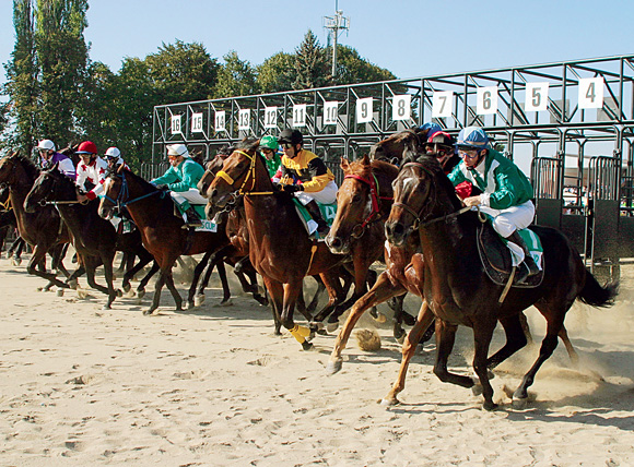 Скачки проводятся на ипподроме. Лошади стартуют из специально